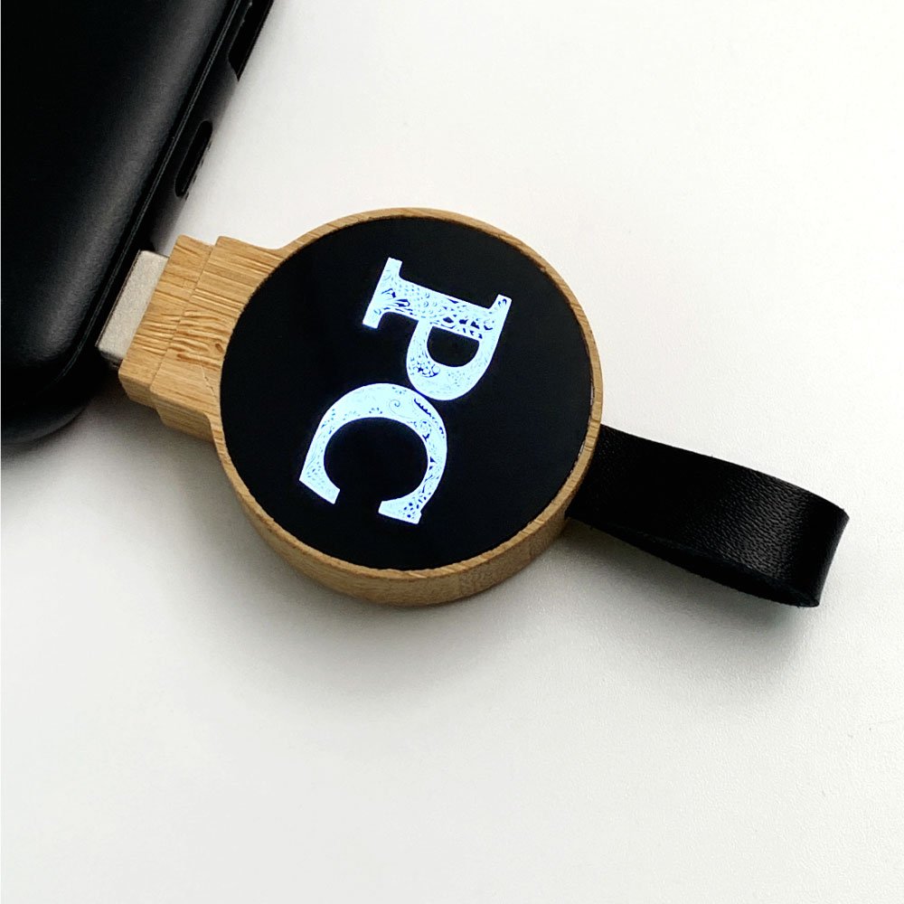 Circular bamboo USB 3.0 drive with leather strap attachment and illuminated logo. Sustainable materials meet modern tech.