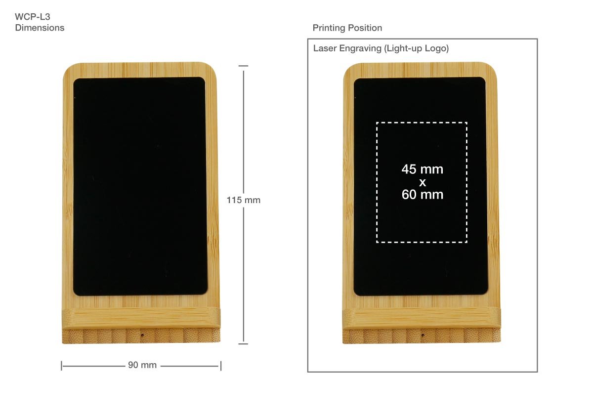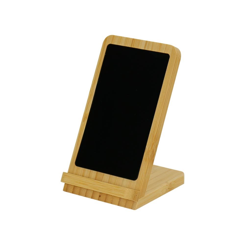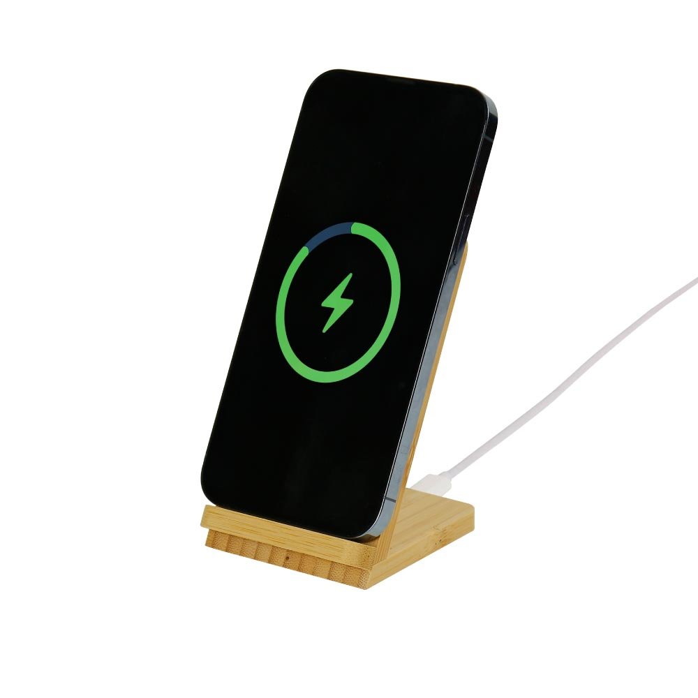 Vertical bamboo charging stand with 15W fast charging and LED-lit logo area. Holds phone at perfect viewing angle while charging.